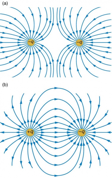 Figure 5 (a) Two negative charges produce the fields shown. It is very similar to the field produced by two positive charges, except that the directions are reversed. The field is clearly weaker between the charges. The individual forces on a test charge in that region are in opposite directions. (b) Two opposite charges produce the field shown, which is stronger in the region between the charges.