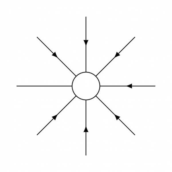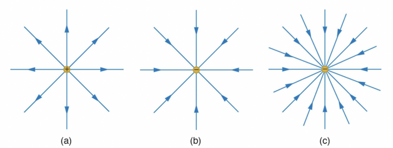 Figure 2 The electric field surrounding three different point charges. (a) A positive charge. (b) A negative charge of equal magnitude. (c) A larger negative charge.
