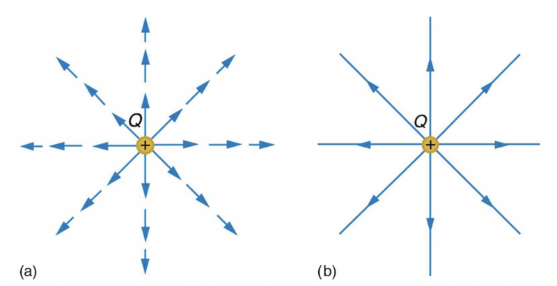 Figure 1 shows two pictorial representations of the same electric field created by a positive point charge \(Q\)Figure 1 (b) shows the standard representation using continuous lines. Figure 1 (a) shows numerous individual arrows with each arrow representing the force on a test charge \(q\). Field lines are essentially a map of infinitesimal force vectors.