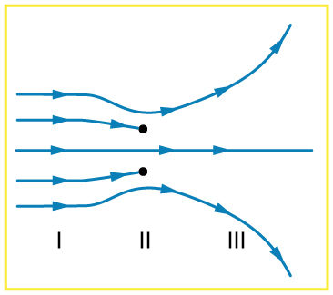 The figure below shows an electric field extending over three regions, labeled I, II, and III. Answer the following questions.