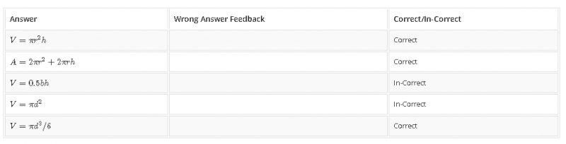 A student is trying to remember some formulas from geometry. In what follows, assume \(A\) is area, \(V\) is volume, and all other variables are lengths. Determine which formulas are dimensionally consistent. Of the options below, choose the 3 options that are correct.