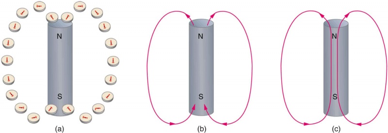 Einstein is said to have been fascinated by a compass as a child, perhaps musing on how the needle felt a force without direct physical contact. His ability to think deeply and clearly about action at a distance, particularly for gravitational, electric, and magnetic forces, later enabled him to create his revolutionary theory of relativity. Since magnetic forces act at a distance, we define a magnetic field to represent magnetic forces. The pictorial representation of magnetic field lines is very useful in visualizing the strength and direction of the magnetic field. As shown in Figure 1, the direction of magnetic field lines is defined to be the direction in which the north end of a compass needle points. The magnetic field is traditionally called the B-field.
